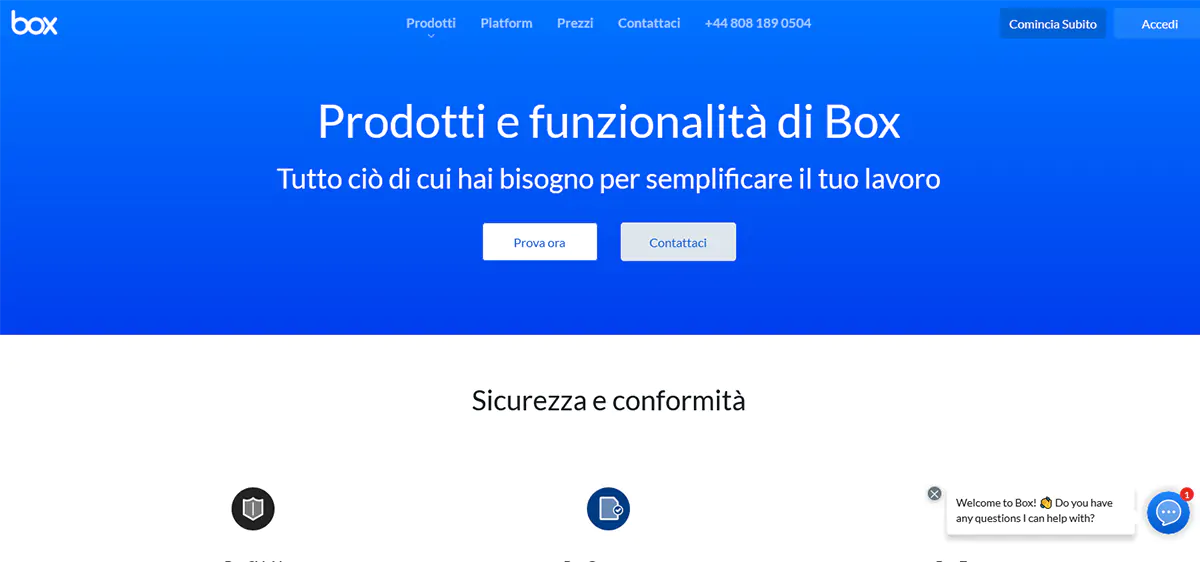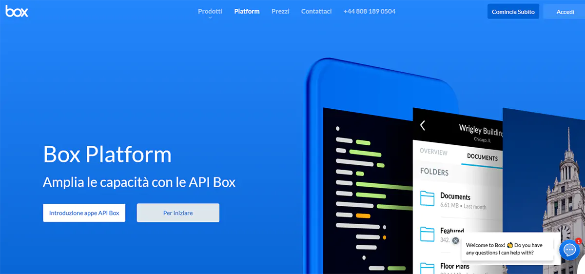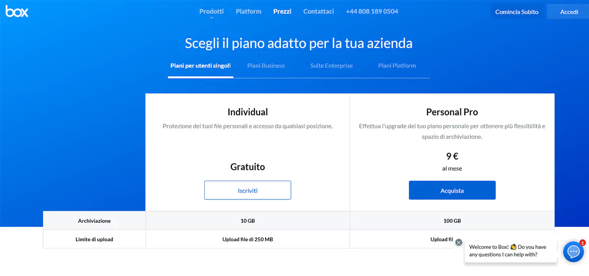 Box.com è un servizio di Cloud Storage rivolto principalmente verso una clientela business, ma che offre ottimi prodotti anche per utenti privati. Box è un sistema affidabile e maturo, e offre una notevole quantità di integrazioni con diverse applicazioni di terze parti, come G-Suite, Slack e Office365.