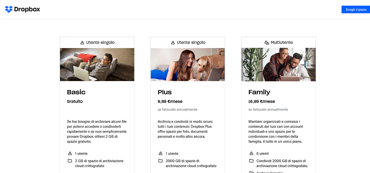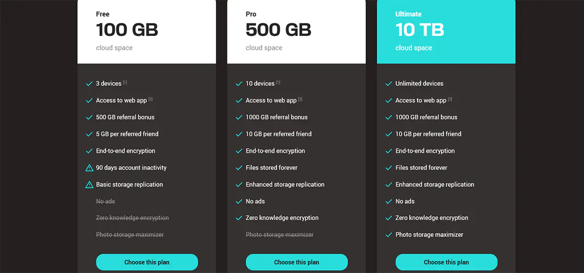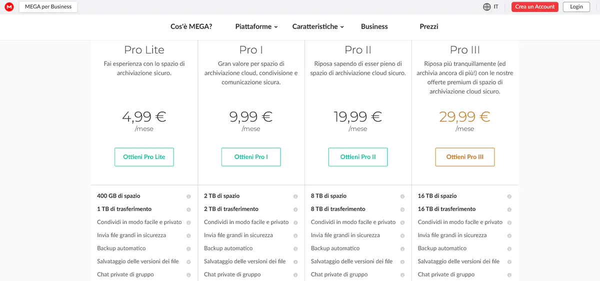 L’azienda offre anche un ottimo piano gratuito con uno spazio di archiviazione di 10 Giga.