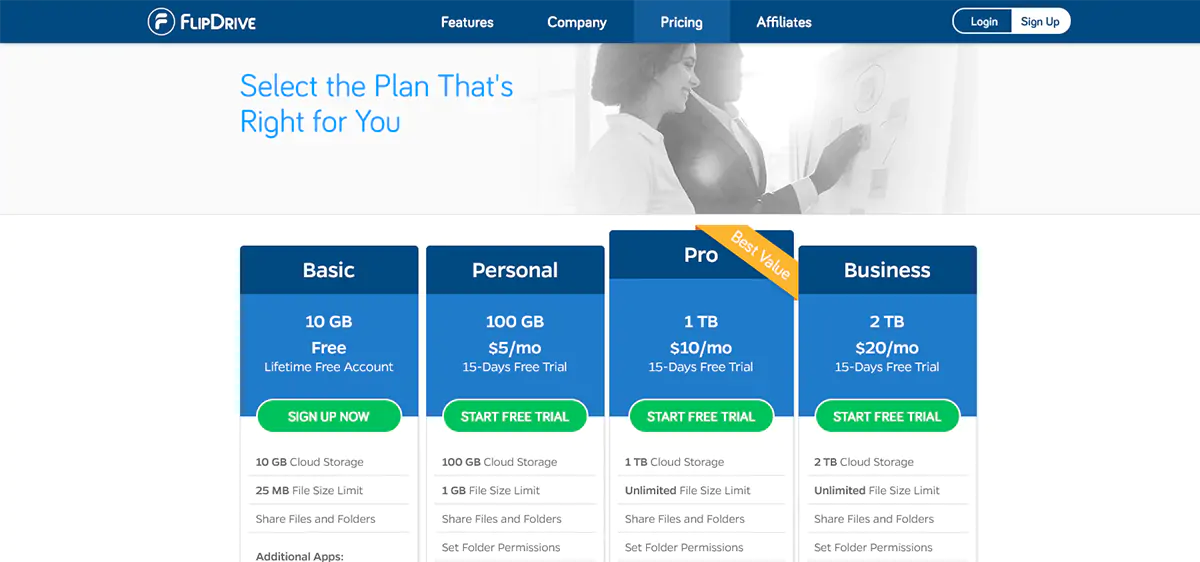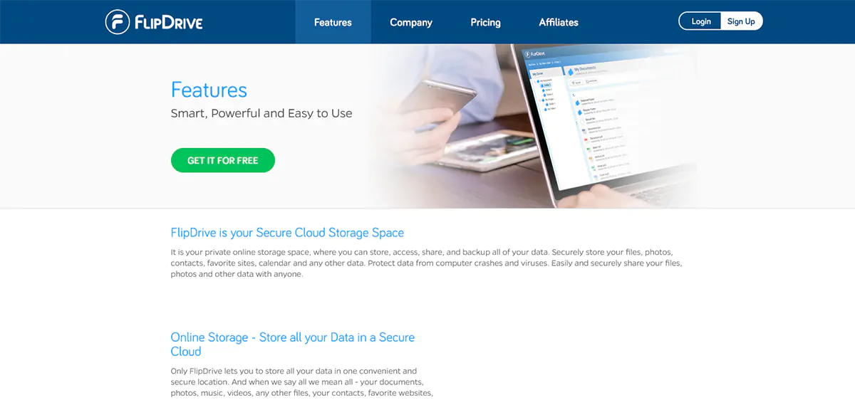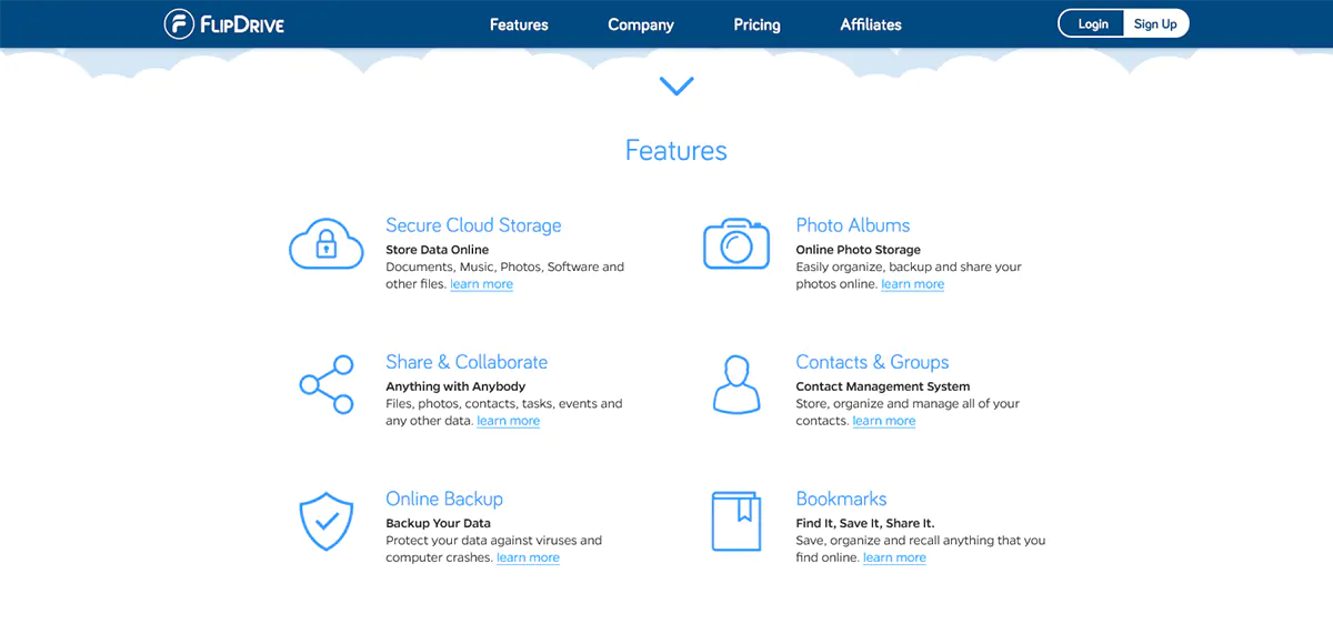 Flipdrive si propone come una soluzione abbastanza semplice, forse anche troppo, per il cloud storage. Il servizio nel complesso non è tra i migliori di questa lista, presentandosi per l’appunto con funzionalità decisamente sotto la media. Offre 10 GB di spazio gratuito. Una grossa pecca, che in effetti ne limita parecchio la diffusione e la qualità del servizio, è la totale assenza di un client installabile sul dispositivo: l’accesso ai file è quindi possibile solo tramite interfaccia web.