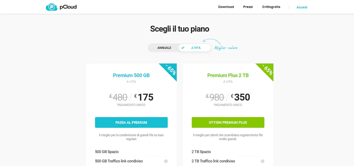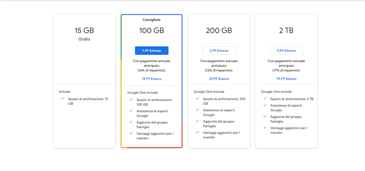 Il prezzo, quando acquistiamo un prodotto o un servizio di qualsiasi genere, finisce inevitabilmente con l’essere uno dei parametri più importanti, se non il più importante in assoluto. I servizi che elenchiamo di seguito hanno piano premium dai prezzi molto variegati, ma in linea di massima i big player si mantengono in un determinato range, e dobbiamo che onestamente i prezzi di questi servizi sono ormai decisamente abbordabili. Scegliete quindi facendo un attento bilanciamento tra qualità del servizio, spazio e costo. E tenete bene a mente anche le altre caratteristiche di cui vi parleremo più avanti.