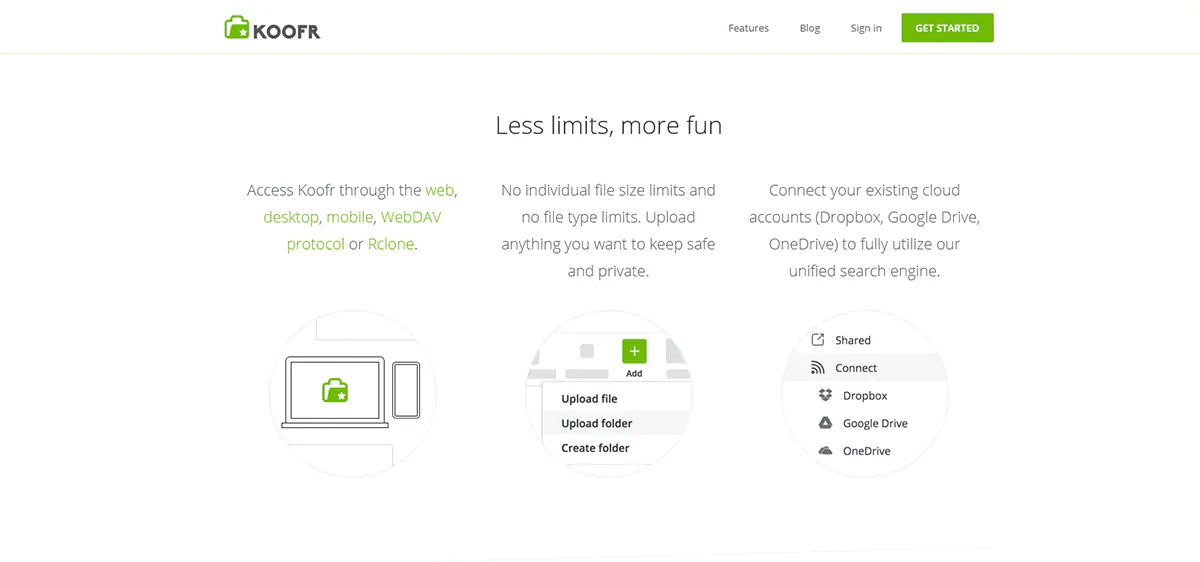 Servizio poco conosciuto in Italia ma con un discreto seguito di estimatori all’estero, Koofr è un servizio che si concentra sulla semplicità. Il sistema è molto semplice e veloce, senza badare ai fronzoli, e le funzionalità offerte sono semplici ed essenziali, forse anche troppo…
