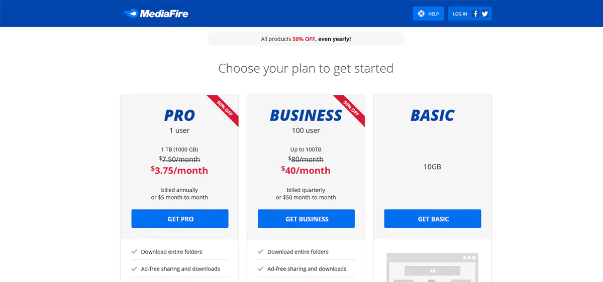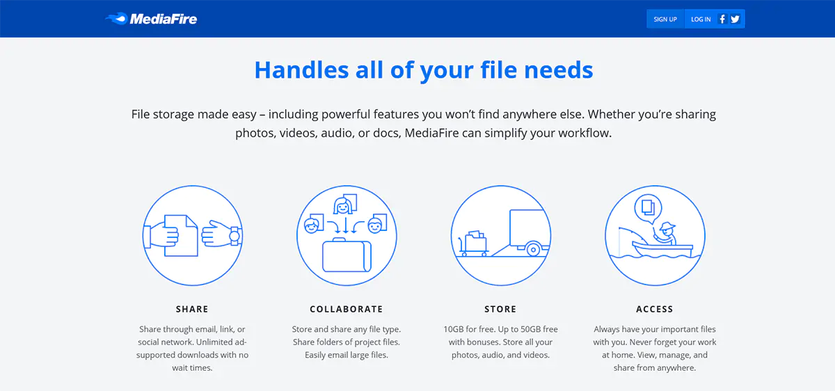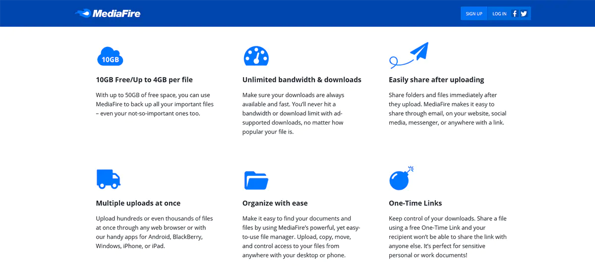 Mediafire è sia un Cloud Storage che un servizio di file sharing, ed è principalmente conosciuto per quest’ultima funzionalità. Come sistema di file sharing in effetti eccelle, ed offre l’interessante funzionalità che permette di condividere file anche con chi non è iscritto al servizio: basta solo che sia in possesso del link. Come Cloud Storage non è certo un prodotto eccellente, e a nostro giudizio non è di certo tra i migliori di quelli citati nell’articolo, anzi, essendo parecchio lontano dai migliori servizi del settore in quanto a funzionalità. Ovviamente non dimentichiamo che nasce per fare altro. Da segnalare la disponibilità nel piano gratuito della ragguardevole quantità di 10 GB di spazio e nessun limite di banda utilizzabile.