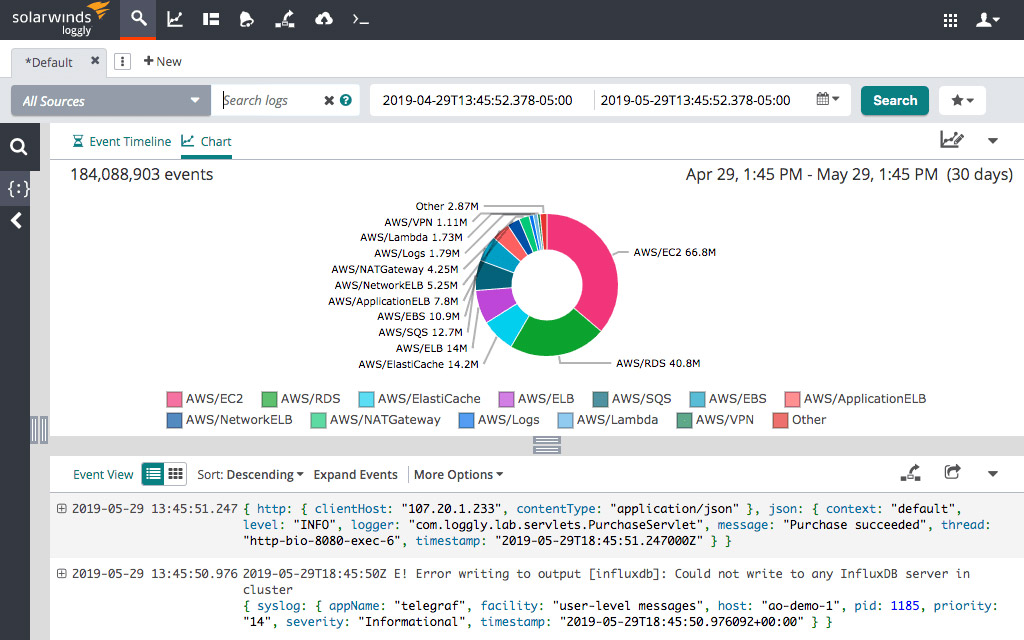 Di converso Loggly fornisce una funzione di archiviazione dei log abbastanza limitata: i log vengono scritti in batch periodicamente e, sebbene sia disponibile una funzione di esportazione dei dati che consente la creazione di report, i dati possono essere archiviati solo in formato raw, CSV o JSON. Tale standardizzazione risulta tuttavia compensate dalla grande versatilità del prodotto nell’aggregare log da fonti molto diverse.