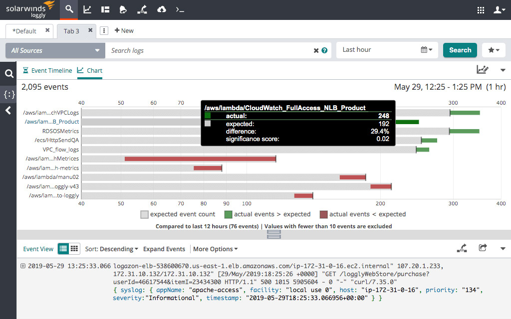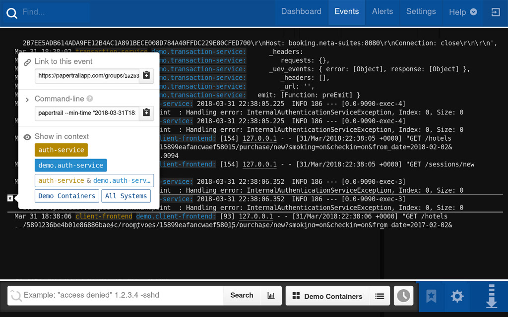 Papertrail offre inoltre una funzionalità utilissima che permette di mostrare in tempo reale gli eventi mentre si verificano. Questo sistema di visualizzazione eventi è perfettamente integrato con il sistema di ricerca e funziona egregiamente. È inoltre possibile impostare degli alert che inviano notifiche agli admin al verificarsi di un determinato evento o condizione sul sistema. Loggly invece visualizza automaticamente i log man mano che vengono ricevuti, li aggrega e quindi ne estrae i dati (in base alle query preimpostate dall’amministratore) per fornire il risultato, ma la visione d’insieme degli eventi risulta più completa su Papertrail.