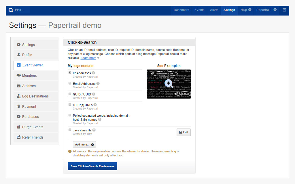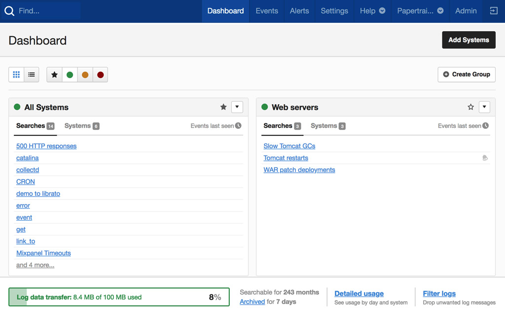 Papertrail fornisce invece una visione più dettagliata degli archivi e le sue funzioni di archiviazione sono più avanzate di quelle di Loggly. Gli utenti possono anche recuperare rapidamente più archivi o uno solo a seconda delle necessità.