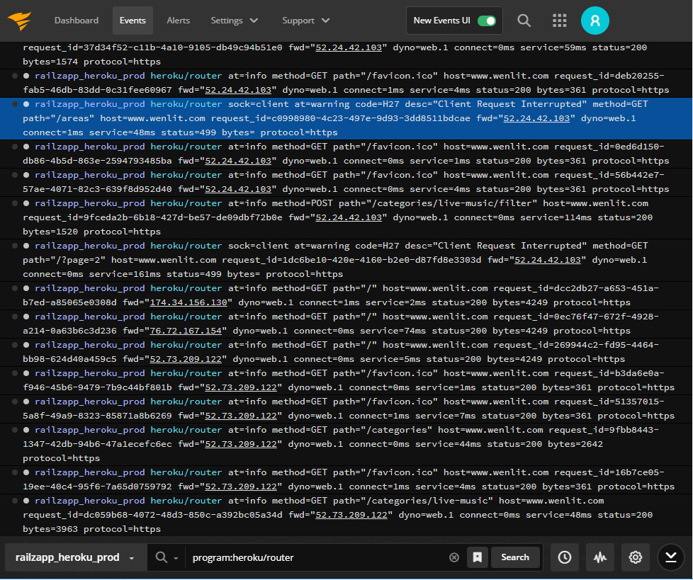 Papertrail di converso risulta più semplice e veloce da configurare e offre una funzionalità di ricerca potente e veloce, in grado di districarsi egregiamente tra aggregati di log anche di notevoli dimensioni. La grande velocità del sistema di ricerca di Papertrail aiuta molto anche nella ricerca proattiva di eventali problemi o anomalie nel sistema monitorato.
