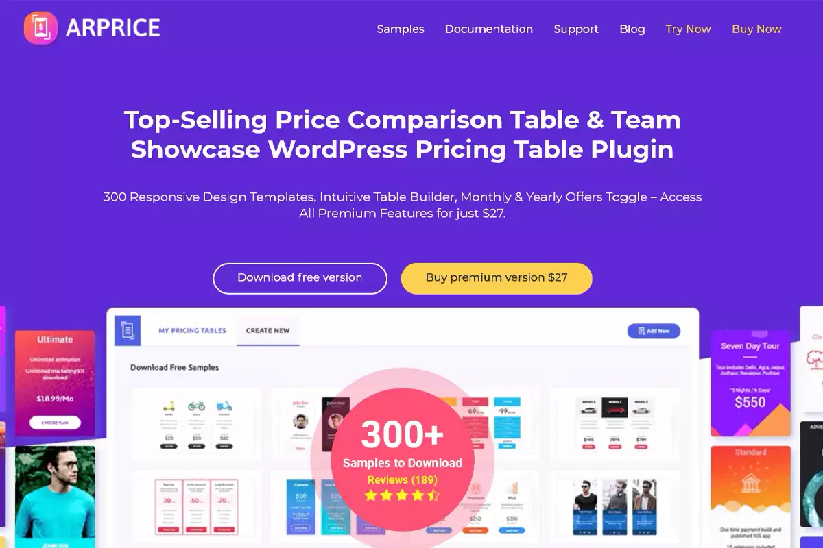 La versione completa di AP Pricing Tables viene venduta a una tariffa una tantum di 15 $. Aggiunge altri 30 design di tabelle pre-progettati, funzionalità di importazione ed esportazione, duplicazione di tabelle, icone dei caratteri da più fonti e supporto per l’integrazione di audio e video.