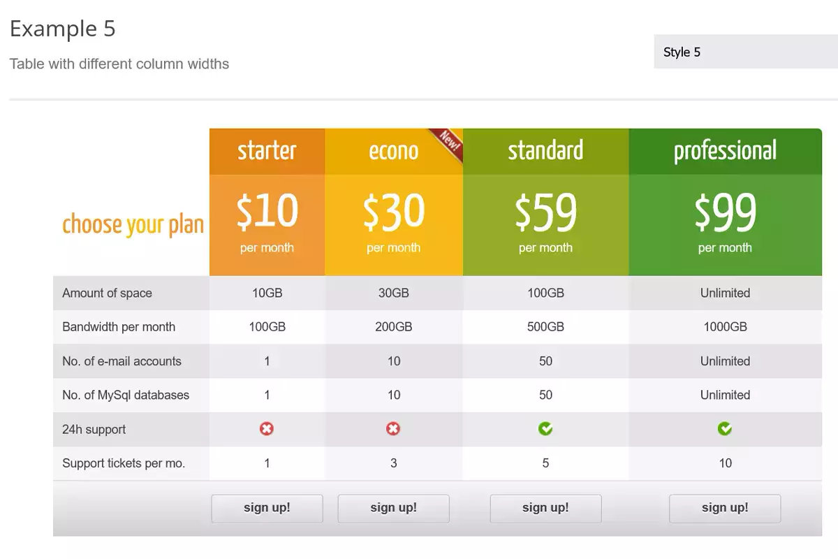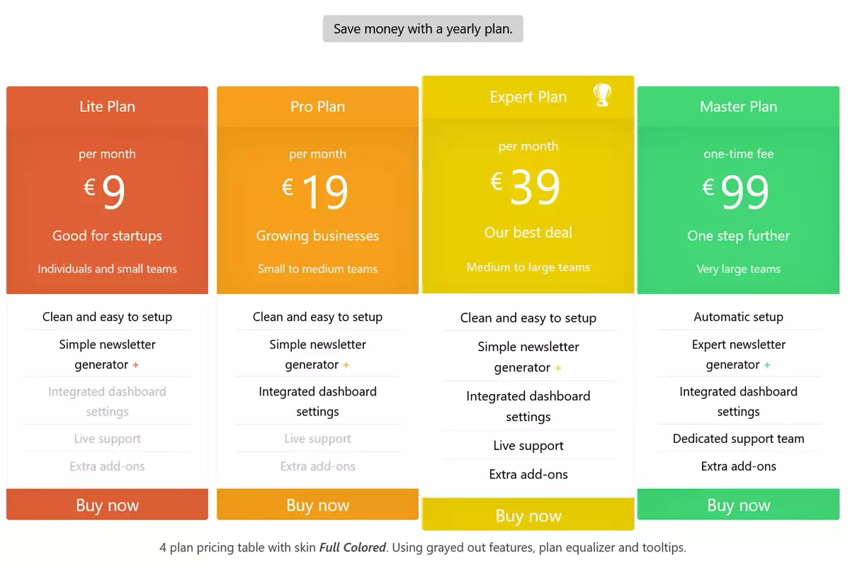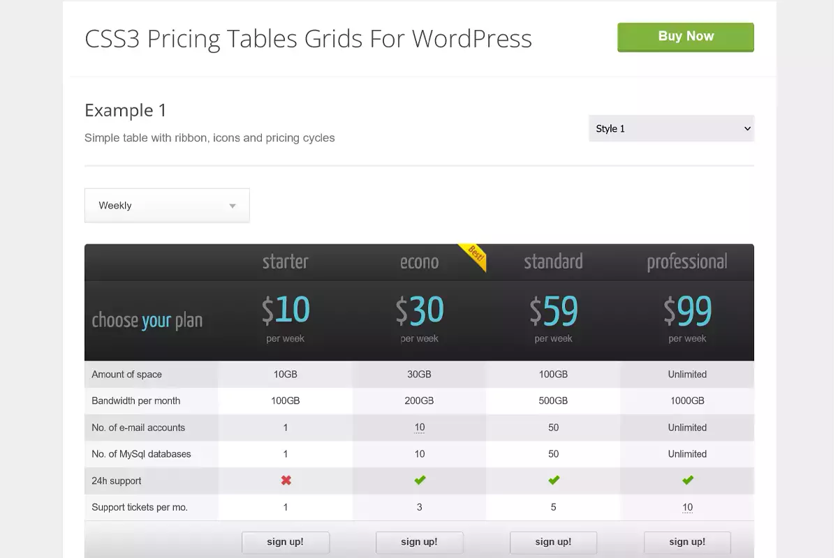 Rilasciato nel 2011, CSS3 Responsive Web Pricing Tables Grids è un plug-in fornito con due stili di tabella e 20 schemi di colori predefiniti.