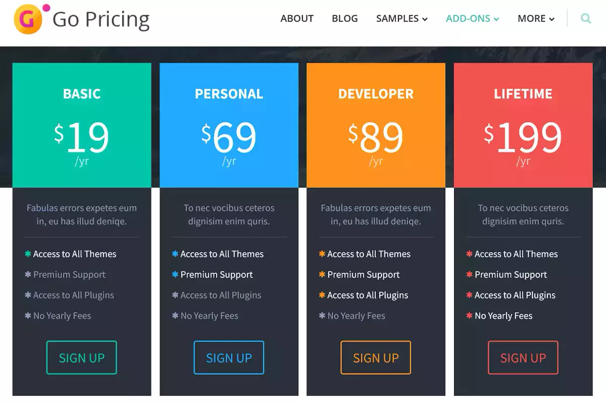 Se invece state cercando il miglior plug-in WordPress per la tabella dei prezzi presente sul mercato, a nostro avviso le due migliori opzioni sono Go Pricing e la versione completa di ARPrice. Entrambi offrono design di alta qualità, funzionalità avanzate e centinaia di opzioni di personalizzazione.
