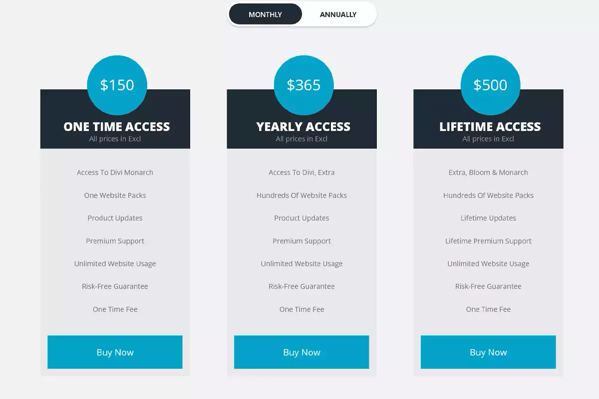 Le tabelle dei prezzi sono la soluzione ideale per le aziende che hanno una gamma di opzioni di vendita dipendente da diversi fattori e intendono mostrare tale gamma ai loro clienti in maniera chiara. Una semplice tabella fornisce un’istantanea del prezzo e delle caratteristiche di ciascuna opzione; pro e contro. I visitatori possono quindi valutare le loro opzioni finché non trovano quella giusta per loro.