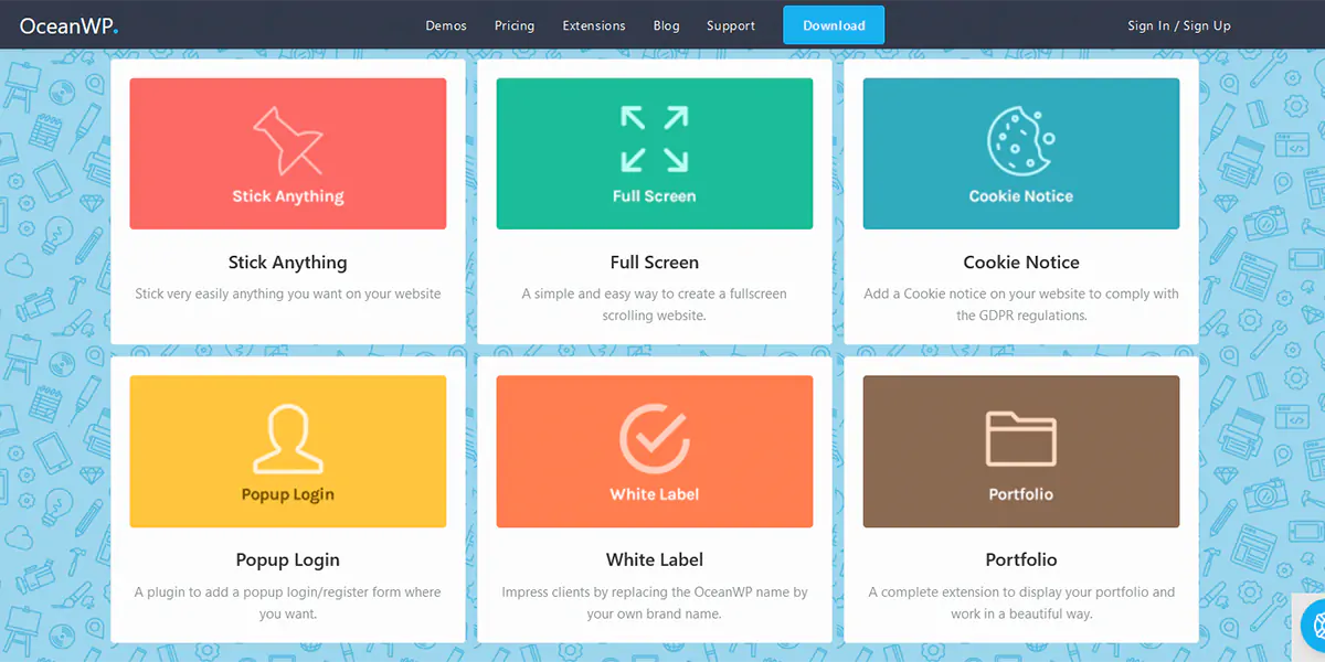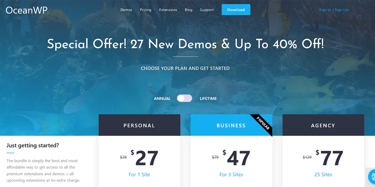 OceanWP è offerto in versione Free e in versione Premium, la quale può a sua volta ampliata nelle sue caratteristiche di base grazie ad una notevole quantità di estensione premium, sviluppate sempre dalla stessa casa madre, che ne estendono le funzionalità.