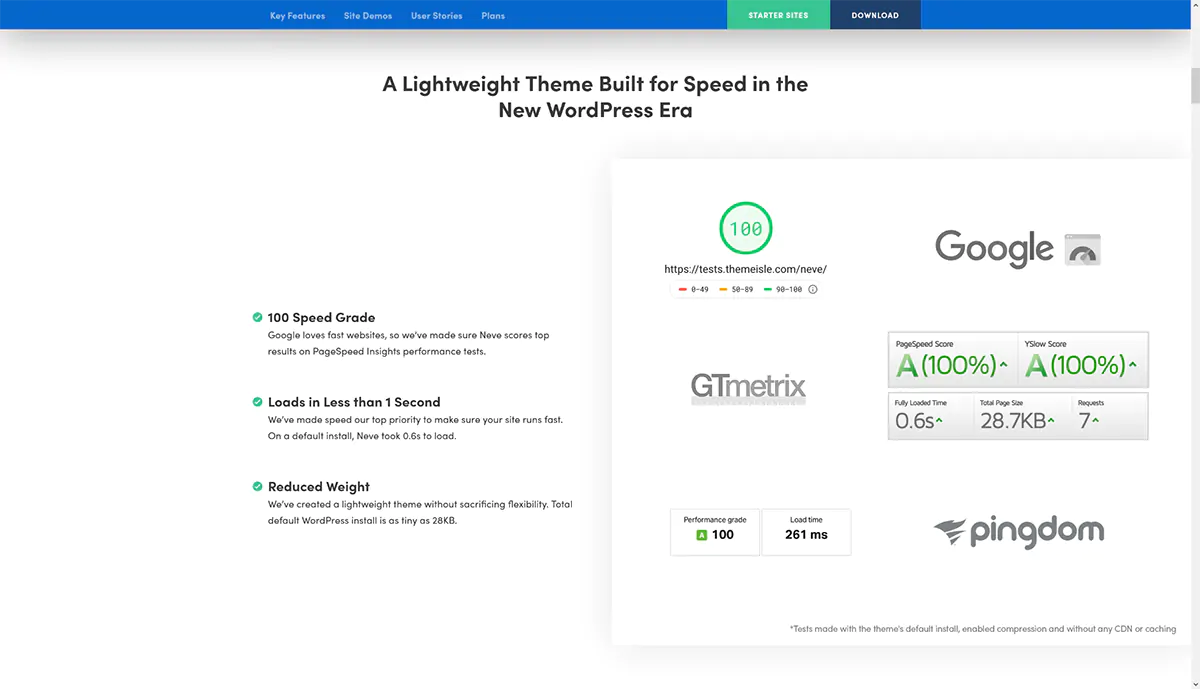Neve si propone agli utenti come un tema orientato alle performance, e da questo punto di vista non delude affatto le aspettative: numerosi test, realizzati da importanti blog del settore, hanno dimostrato che Neve in quanto a prestazioni si trova stabilmente in cima alla classifica. Si tratta di uno dei temi più veloci tra quelli di cui parliamo in questo articolo, contendendosi il podio con Astra, OceanWP e StudioPress.