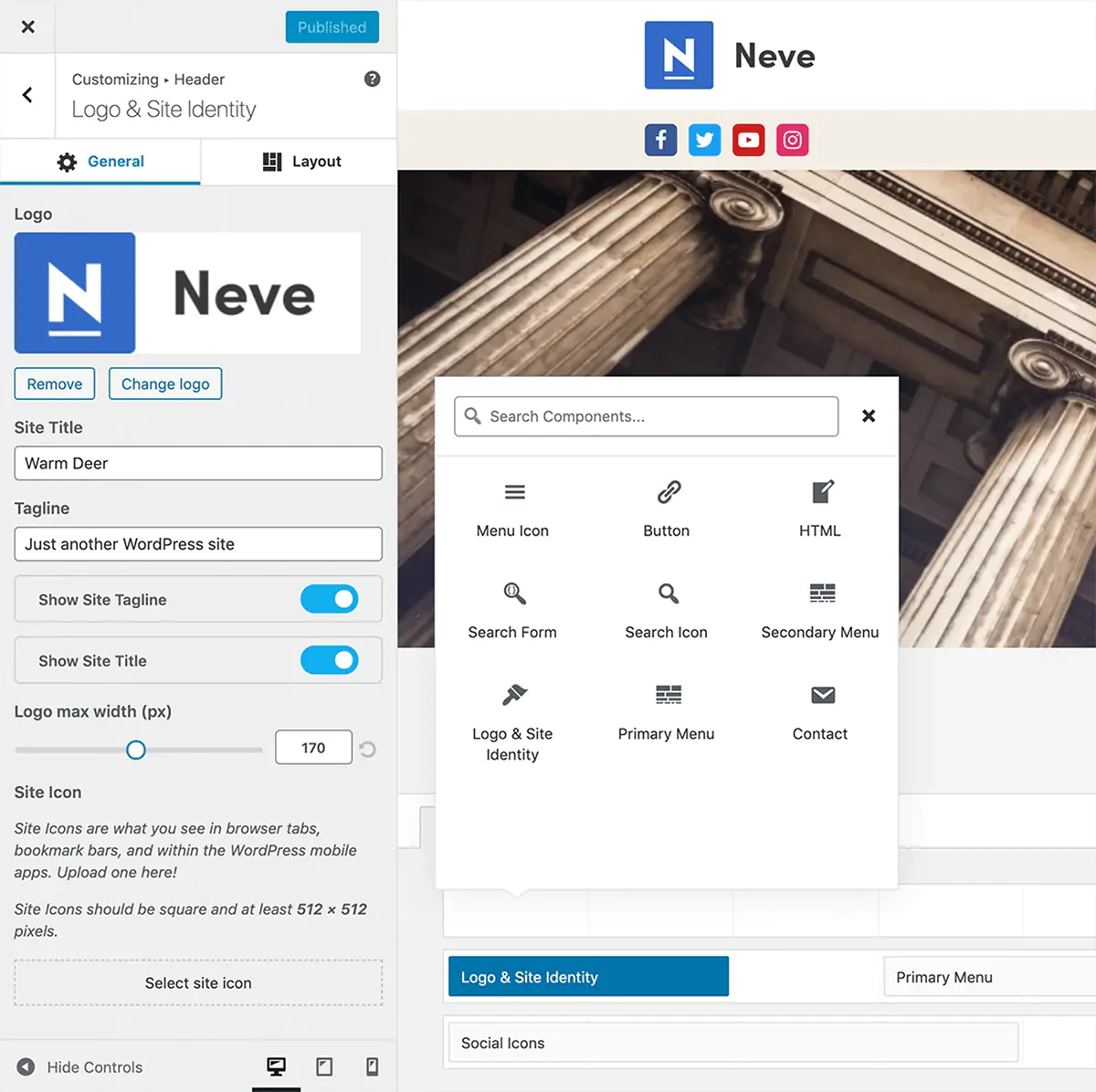 Numerose, anche se non sempre intuitive, sono le opzioni per personalizzare header e footer. Il tema infatti introduce un ulteriore pannello, in basso, che all’inizio può risultare inconsueto, ma appena ci si prende la mano si rivela in effetti decisamente utile.