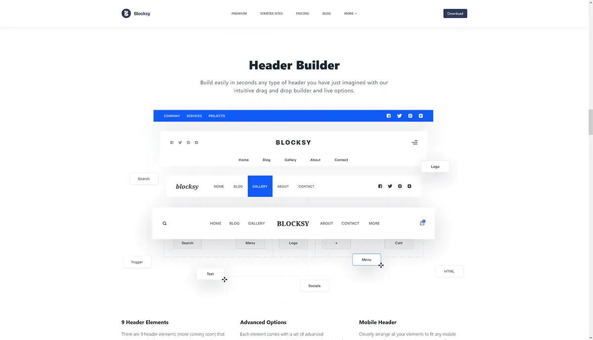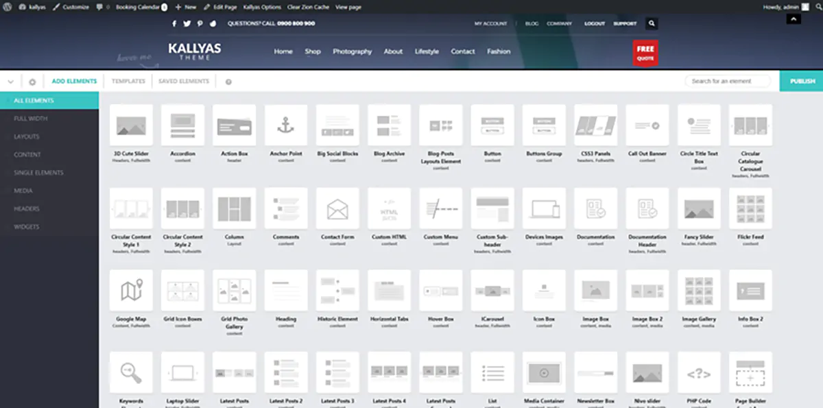 Kallyas si propone come un tema general purpose, adatto quindi a realizzare siti di ogni genere. Il tema offre una ricca galleria di siti demo gratuiti (oltre 75) che è possibile usare per velocizzare lo sviluppo del proprio sito e risparmiare parecchi tempo. Una delle sue principali caratteristiche è la presenza di Zion Builder, un page Builder drag’n’drop, al pari di WPBakery ed Elementor, con il quale è possibile creare in maniera facile e veloce pagine di grande impatto visivo e complessità. Una delle caratteristiche degne di nota di questo plugin drag-and-drop integrato è la possibilità (come nei page builder più blasonati) di effettuare la creazione delle pagine da front-end. Zion Builder, nonostante non goda della fama dei suoi celebri concorrenti, si rivela comunque un ottimo prodotto, che include di default oltre 130 elementi grafici che saranno molto utili nella costruzione delle pagine. Questo builder consente di creare e salvare layout e blocchi e utilizzarli in seguito su altre sezioni del tuo sito web. Aggiungere elementi a una pagina è molto semplice. Il page builder fornisce anche una barra di ricerca per aiutarvi a trovare ciò che state cercando.