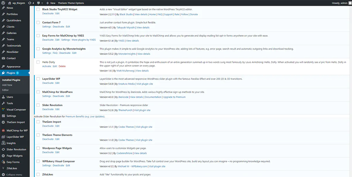 Oltre a WPBakery, TheGem porta in dote numerosi plugin premium preinstallati, consentendo quindi di ottenere un’installazione di WordPress davvero molto completa e funzionale. Tra i plugin preinstallati degni di nota ci sono sicuramente i celebri Slider Revolution e LayerSlider. Inoltre, per non farsi mancare proprio nulla, TheGem mette a disposizione anche una grande quantità di slide precaricate per questi due potenti strumenti.