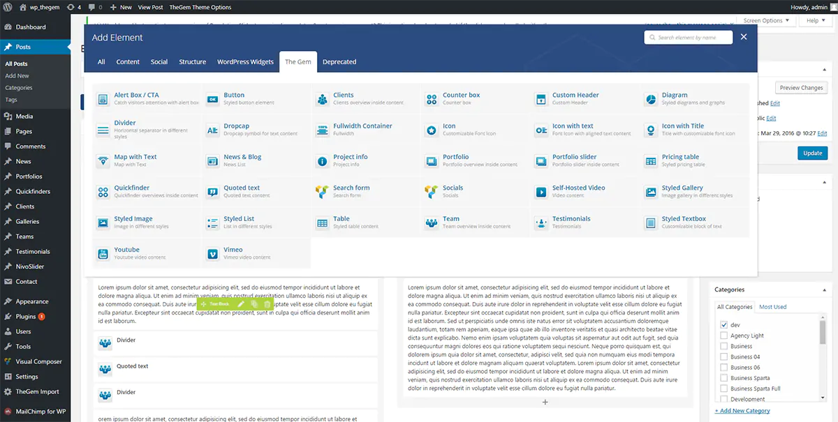 TheGem offre WPBakery come page builder di default e, come detto, lo integra e lo estende con numerosi elementi grafici aggiuntivi, rendendolo quindi ancora più potente. Tramite le conosciute interfacce utente front-end e back-end di WPBakery sarà quindi possibile personalizzare qualsiasi modello predefinito e qualsiasi pagina.